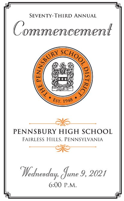 Seventy-Third Annual Commencement Ceremony Pennsbury High School, Class of 2021 Wednesday, June 9, 2021 6 P.M. (Rain Date: Thursday, June 10, 2021)