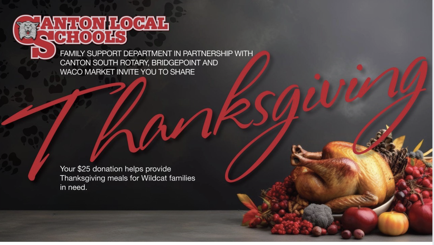 A small processing fee applies to credit/debit payments ($0.98 on a $25 donation). Checks may be made payable to Canton Local Schools with “Feed the Wildcats” in the memo line.