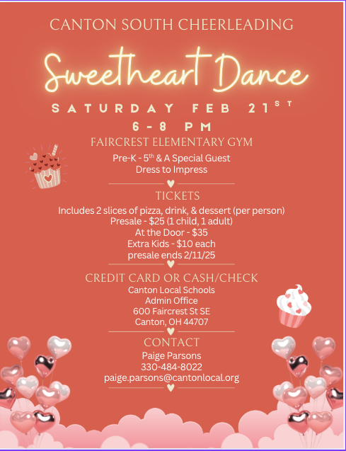 Canton South Cheerleaders are hosting a Sweetheart Dance on Saturday, February 21, 2026, from 6-8pm in the Faircrest Memorial Elementary School gym. Students in grades preschool-5th are invited to bring their special someone (parent/guardian/relative) for a fun night. Come dressed in your best and enjoy food, drinks, a DJ, a photo op, games, and raffles.